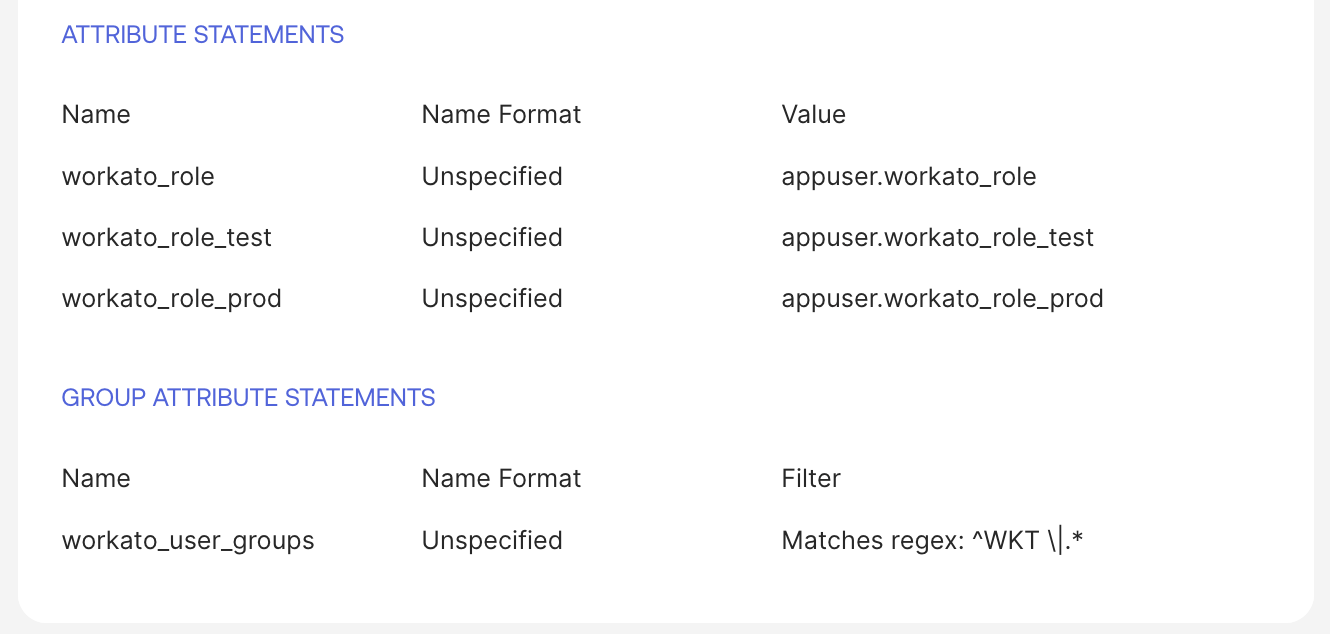 workato_user_groupsSAML attribute if you use collaborator groups. Use direct attribute mappings for a small number of groups, or group attribute statements with regex for larger sets.