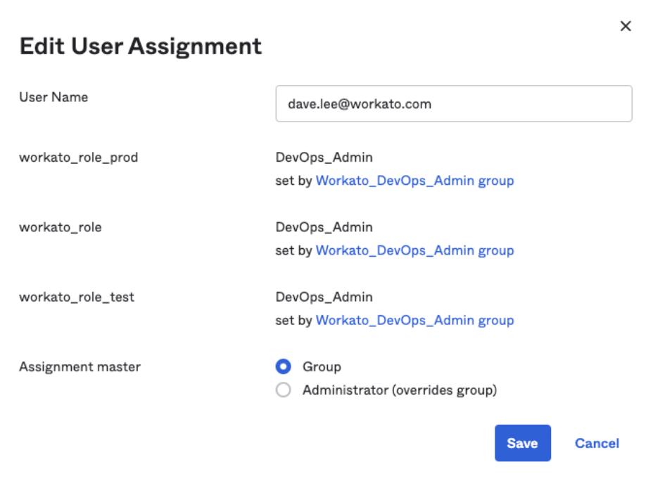Users added to these Okta groups automatically receive the corresponding environment roles in Workato.