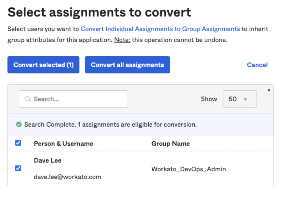 Choose Convert selected to migrate individual users to group-based assignments, or click Convert all assignments for bulk conversion.