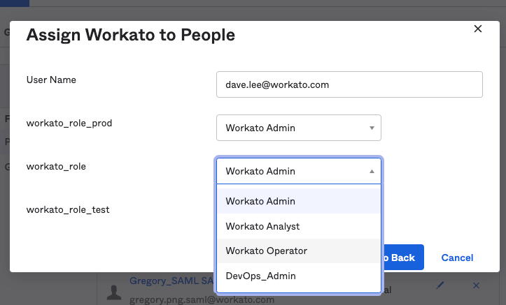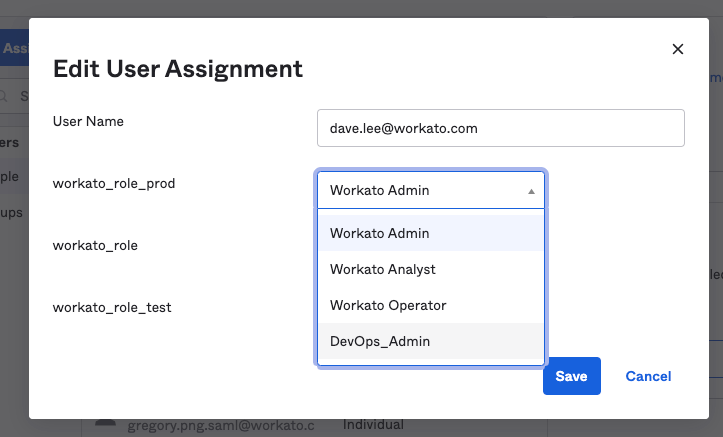 To update a user's role, select a new value from the appropriate environment attribute (for example, workato_role, workato_role_prod, or workato_role_test), and then click Save.
