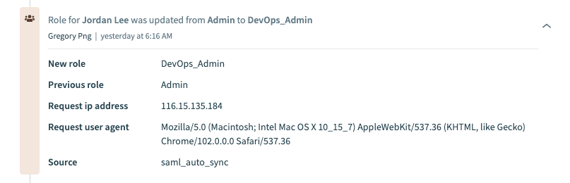 Role changes triggered by SAML assertions appear under the Source attribute, with the value saml_auto_sync.