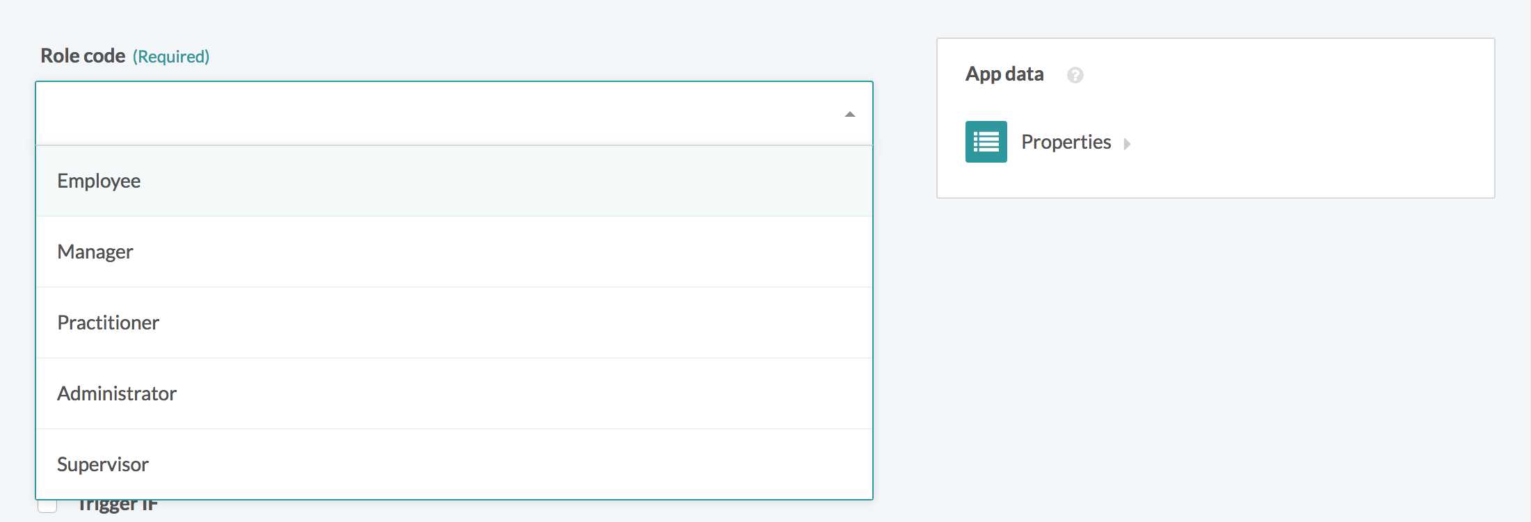 このトリガーに対してフィルタリングする従業員の種類を選択します。以下のオプションから選択できます。- Employee - Manager - Practitioner - Administrator - Supervisor | |