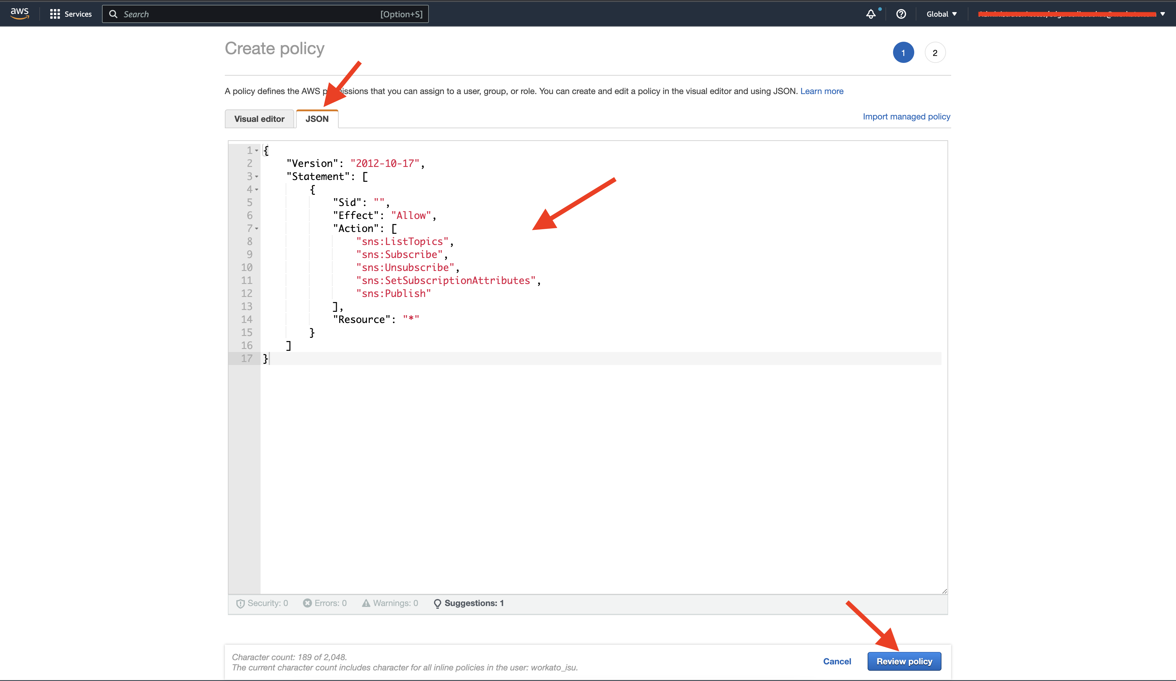 [Review policy] ビューで、ポリシーに対してわかりやすい名前 (たとえば workato_isr-sns_connector) を付けます。[Create policy] をクリックします。 ポリシーの作成 ポリシーの作成