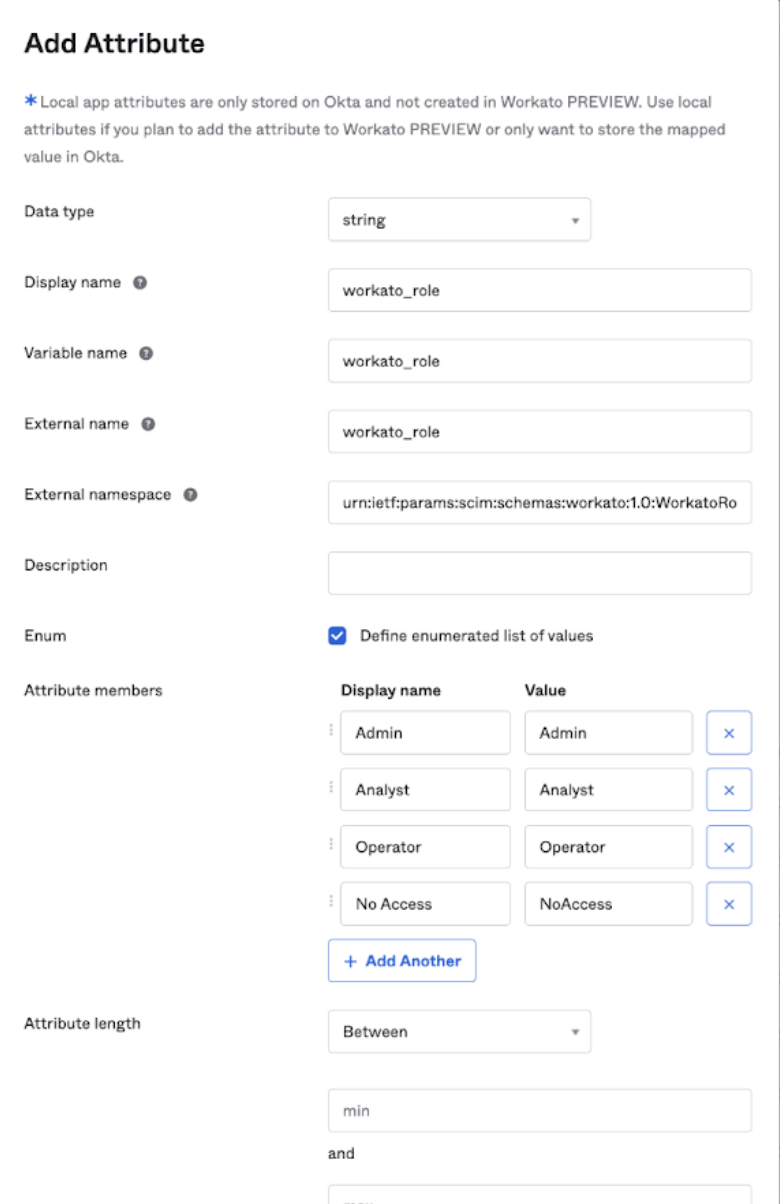 - 値の列挙リストを定義し、属性メンバーを追加します。これらはWorkatoでユーザーに割り当てることができるロールです。たとえば、