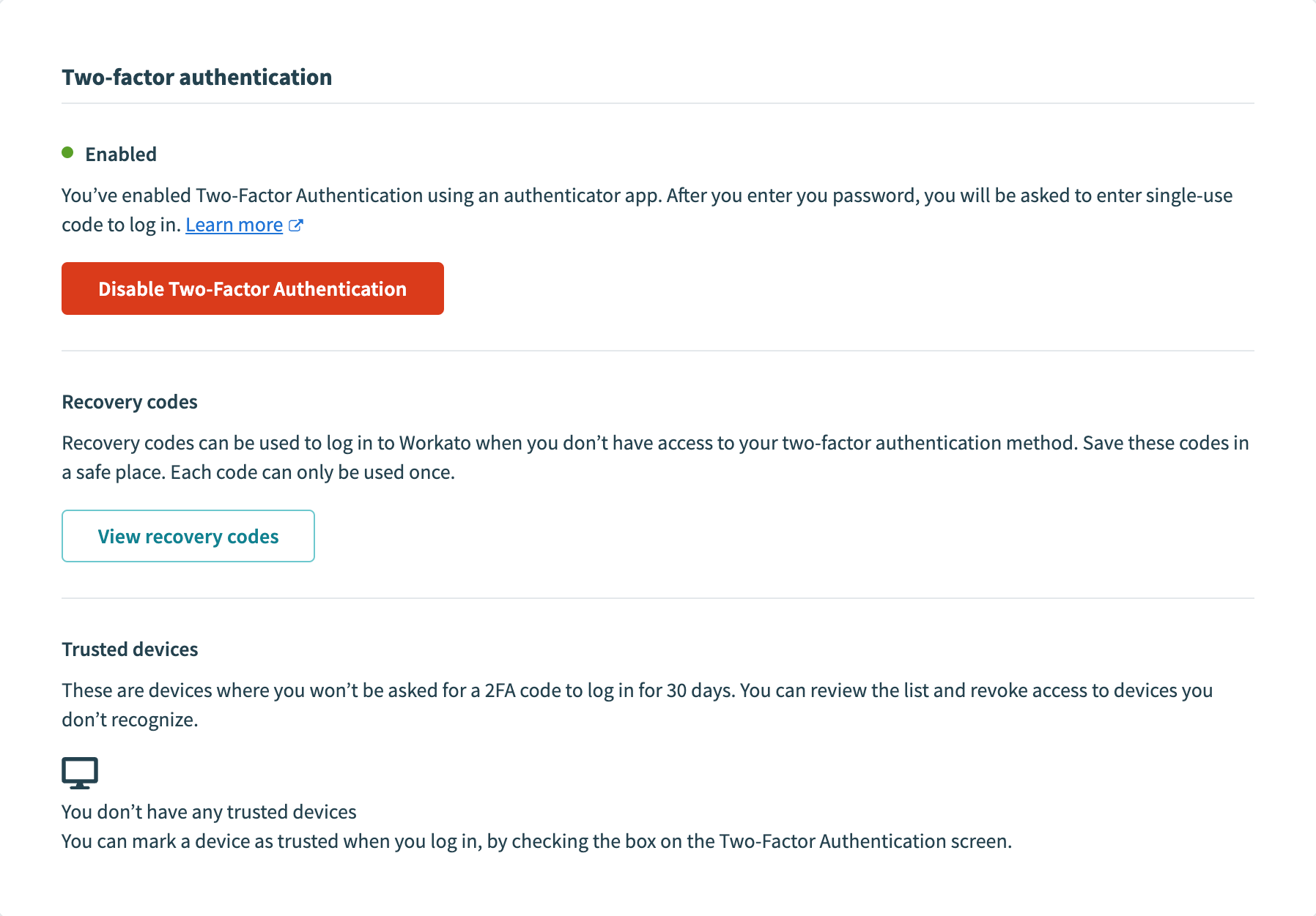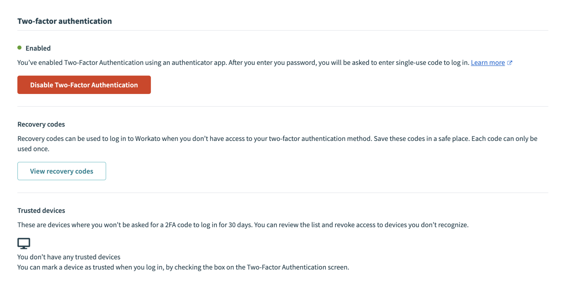 以上で終了です。これで Workato の2要素認証の設定が完了しました。この設定は一度しておけば以降も有効です。![]() 2要素認証が有効 |