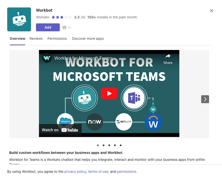 Workbot は Workato 上に構築されているボットプラットフォームです。Teams から直接、業務ワークフローを実行することを可能にします。
