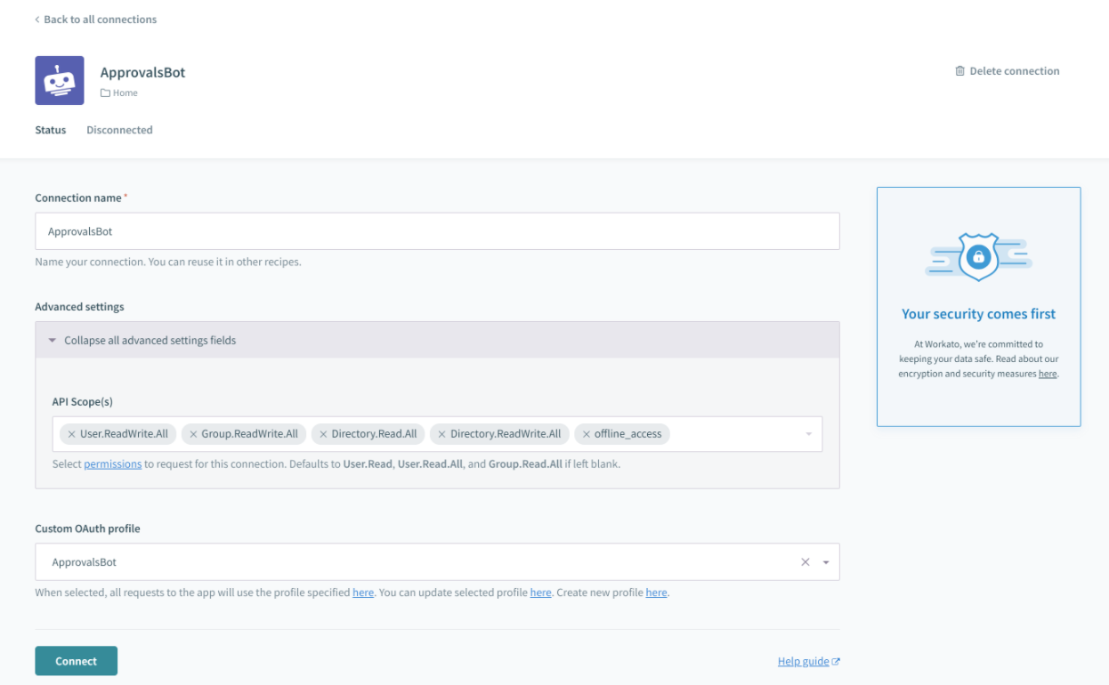 • Custom OAuth profile: Select the custom OAuth profile you want the bot to use.