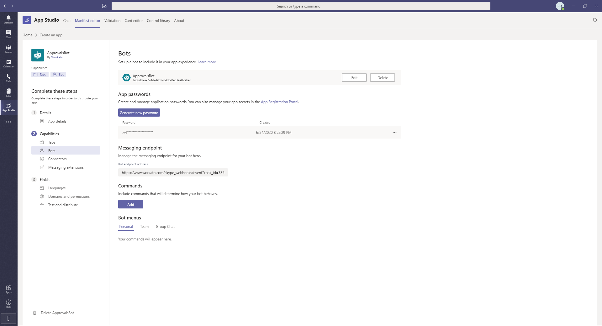 As of January 1, 2022, Microsoft has deprecated App Studio. To create Enterprise Workbots, use the Microsoft Teams Developer Portal guide. We're retaining this guide for reference only.