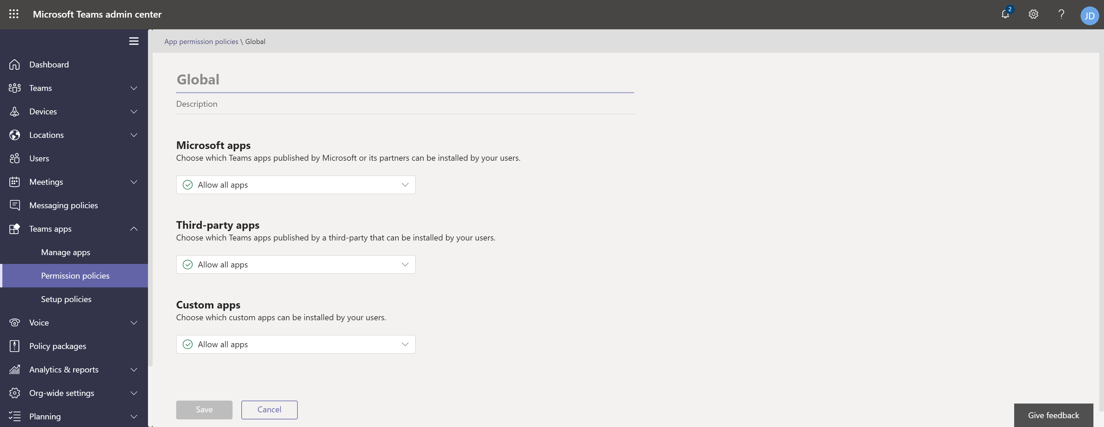 Navigate to Teams apps > Permission policies.
