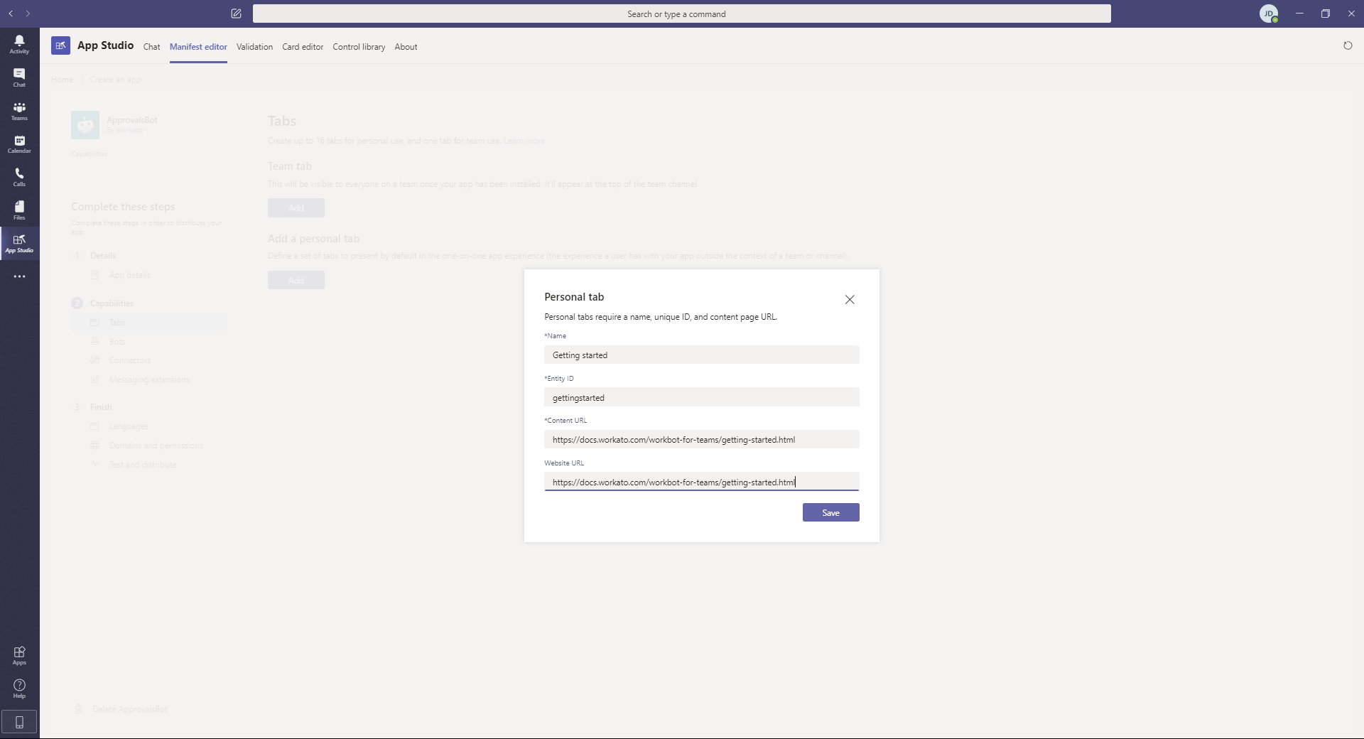 Complete the following steps to add a personal tab to your bot: