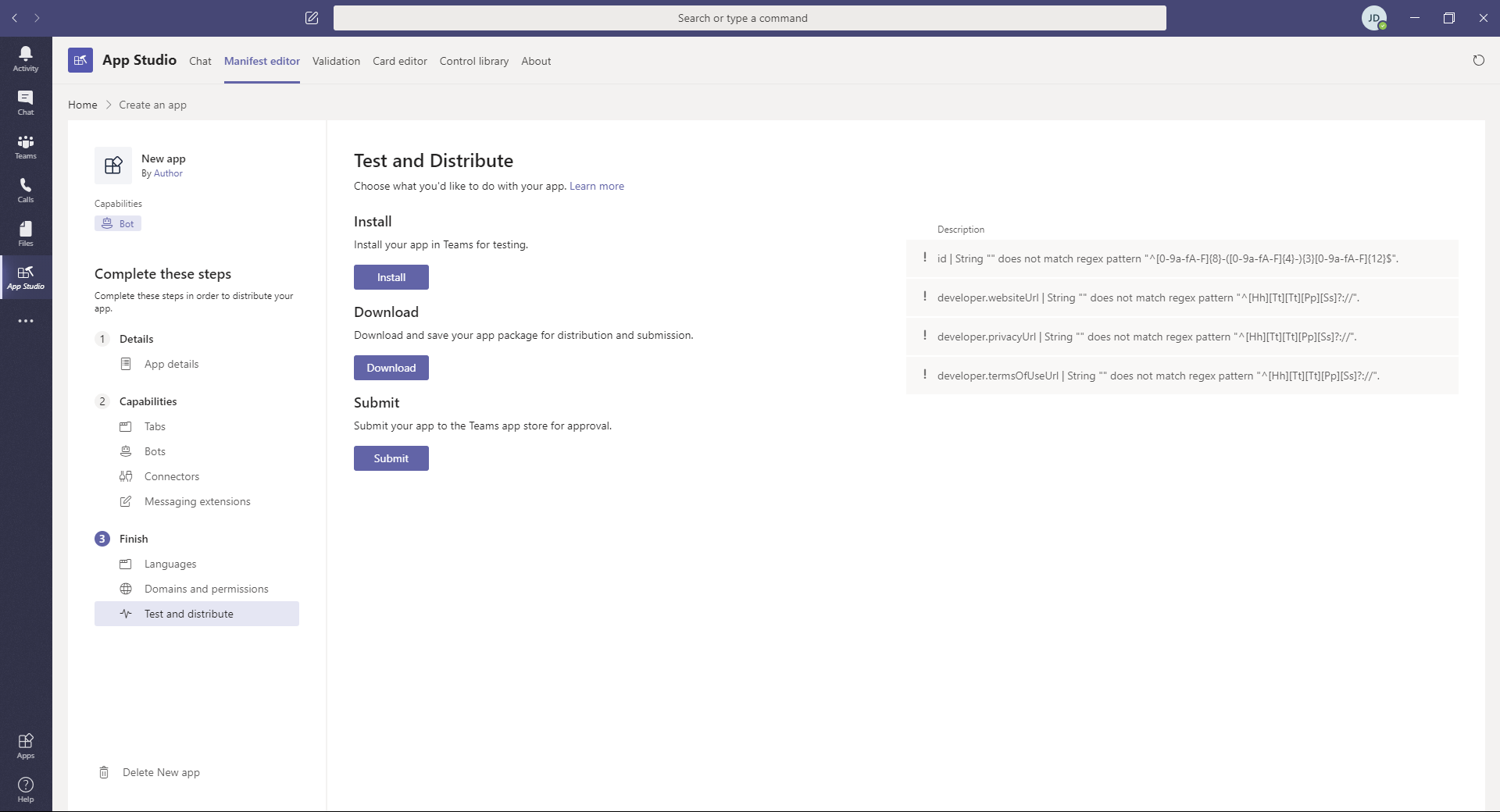 If there are any errors on the right side of the page, resolve them before proceeding. If left unresolved, you may run into issues with installation or downloading your app package (a.k.a. manifest). These issues are typically related to fields in Details > App details or Capabilities > Bots.