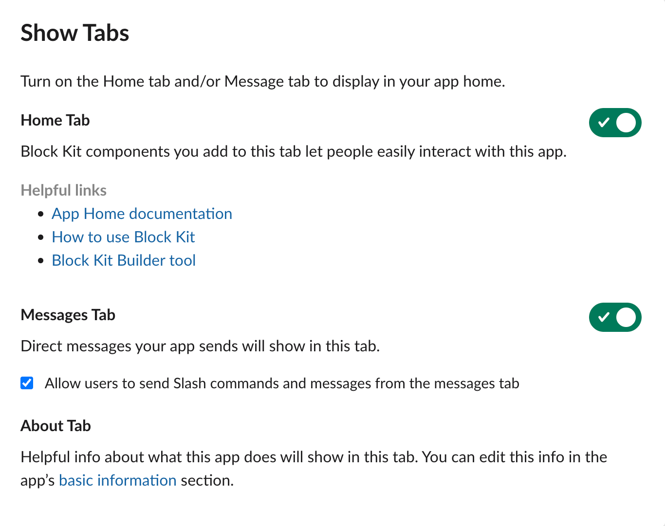 Go to Features > App Home > Show Tabs.