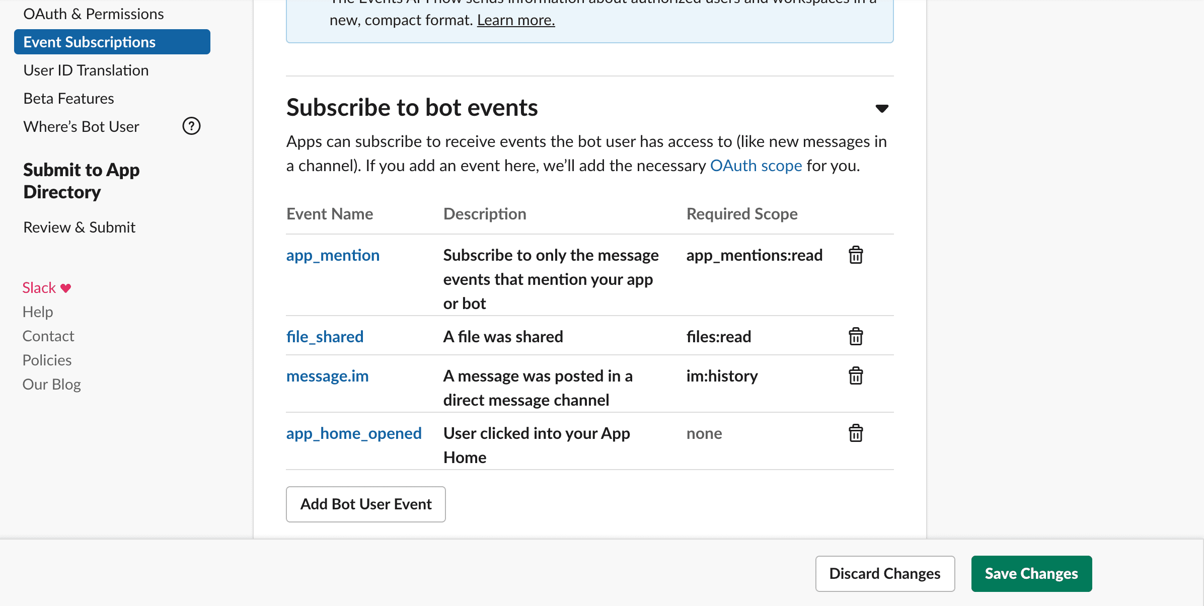 Open your Slack app configuration.